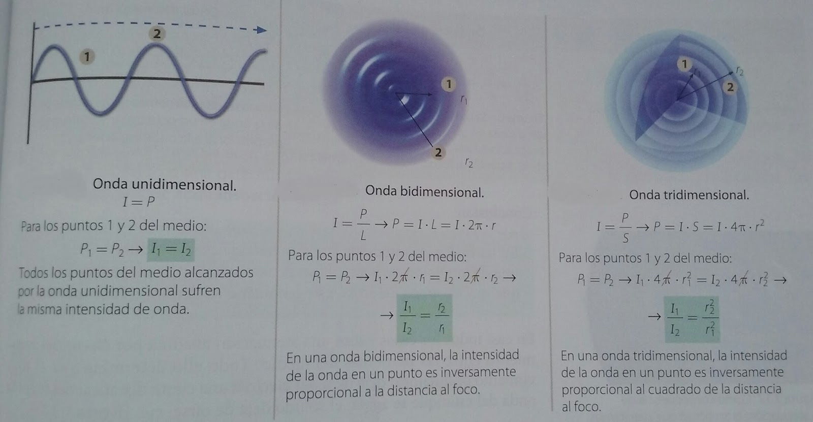 Um pulso em uma corda esticada representa uma onda unidimensional. Ondas na superfície da água são um exemplo de ondas bidimensionais. Ondas sonoras se propagando pelo ar ilustram ondas tridimensionais.